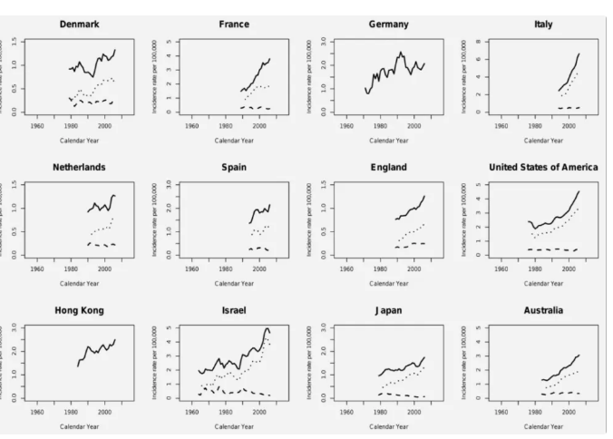 1960 年至 2007 年,在不同國家和地區,男性甲狀腺癌發(fā)病率的總體趨勢呈明顯上升,圖片來(lái)源:參考文獻[4]