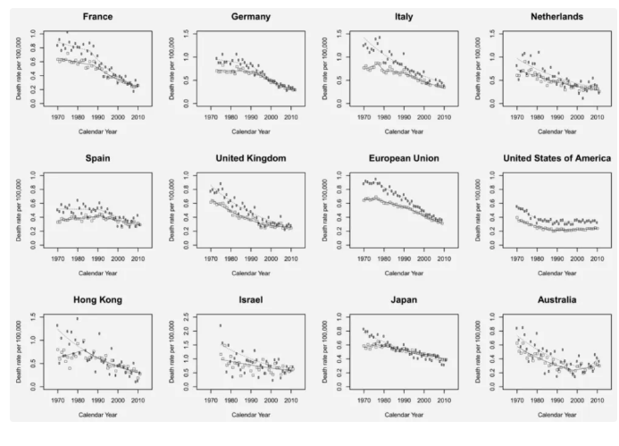 1970 年至 2012 年,在不同國家和地區,男性甲狀腺癌死亡率穩定下降,圖片來(lái)源:參考文獻[4]