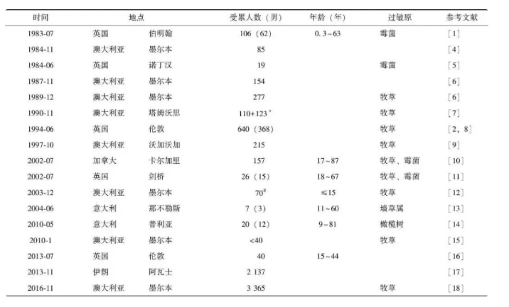 此后,陸續在全球范圍內均有雷暴哮喘事件的相關(guān)報道,主要發(fā)生在英國、澳大利亞,另外加拿大、意大利、伊朗等國家也有類(lèi)似報道。(下方表格中總結了自1983年以來(lái)文獻報道過(guò)的雷暴哮喘事件)