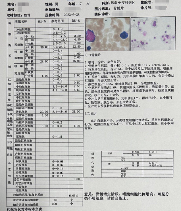 IGE:5919 IU/mL↑,血常規嗜酸性粒細胞:30.7%↑,骨髓活檢嗜酸性粒細胞易見(jiàn),結合實(shí)驗檢查結果及患者臨床癥狀,出院診斷:木村病.