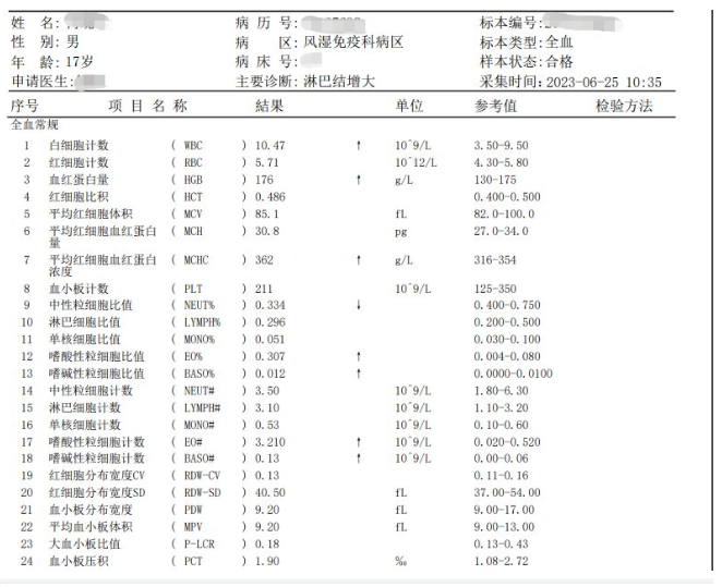 骨髓細胞學(xué)意見(jiàn):骨髓增生活躍,嗜酸性粒細胞增高,可見(jiàn)分類(lèi)不明細胞,請結合臨床,骨髓細胞學(xué)檢查初步排除淋巴瘤骨髓浸潤及血液病可能?;颊叩氖人嵝粤<毎吲c全身淋巴結腫大有必然的聯(lián)系么?當患者出院后,查閱了患者的相關(guān)實(shí)驗檢查,見(jiàn)圖4: