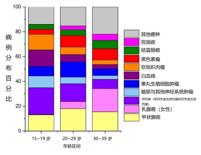 2012 年至 2016 年青少年和青壯年主要癌癥類(lèi)型的病例分布(%),圖片來(lái)源:參考文獻[5]