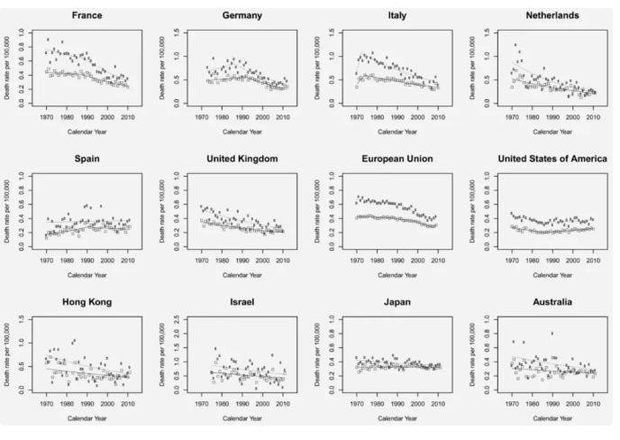 1970 年至 2012 年,在不同國家和地區,男性甲狀腺癌死亡率穩定下降,圖片來(lái)源:參考文獻[4]