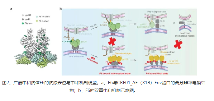 F6是第一株分離自CRF01_AE感染個(gè)體的廣譜中和抗體。研究團隊還通過(guò)高分辨率冷凍電鏡結構解析揭示了F6在Env蛋白上的詳細抗原表位(圖2a),并進(jìn)一步通過(guò)結構分析與功能實(shí)驗驗證闡明了F6的新型中和機制(圖2b):F6一方面通過(guò)變構效應擾動(dòng)Env蛋白三聚體Apex區域的穩定性,破壞Env蛋白與宿主CD4受體的結合,另一方面通過(guò)誘導三聚體的解體來(lái)阻礙Env蛋白介導的病毒包膜與細胞膜的融合,進(jìn)而抑制病毒對于宿主的入侵(圖2b)。