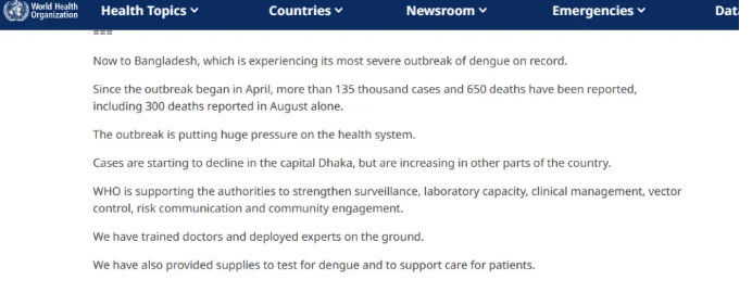 世衛組織(WHO)周三表示,孟加拉國正在經(jīng)歷有記錄以來(lái)最嚴重的登革熱疫情,自4月份疫情爆發(fā)以來(lái),該國報告了超過(guò)13.5萬(wàn)例登革熱病例,已有650多人死亡。