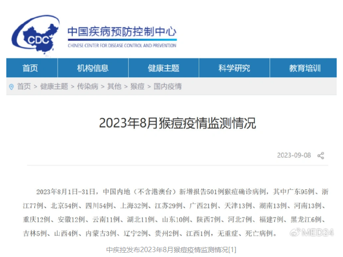 9月8日,中疾控發(fā)布8月猴痘疫情監測情況[1]。2023年8月1日-31日,中國內地(不含港澳臺)新增報告501例猴痘確診病例,相較7月增加10例。